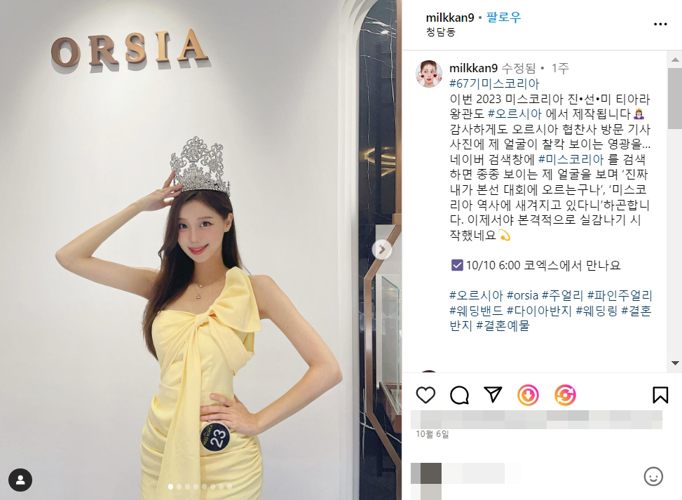 이번 2023 미스코리아 진•선•미 티아라 왕관도 오르시아 에서 제작됩니다👸🏻감사하게도 오르시아 협찬사 방문 기사사진에 제 얼굴이 찰칵 보이는 영광을…네이버 검색창에 미스코리아 를 검색하면 종종 보이는 제 얼굴을 보며 ‘진짜 내가 본선 대회에 오르는구나’, ‘미스코리아 역사에 새겨지고 있다니’하곤합니다. 이제서야 본격적으로 실감나기 시작했네요💫