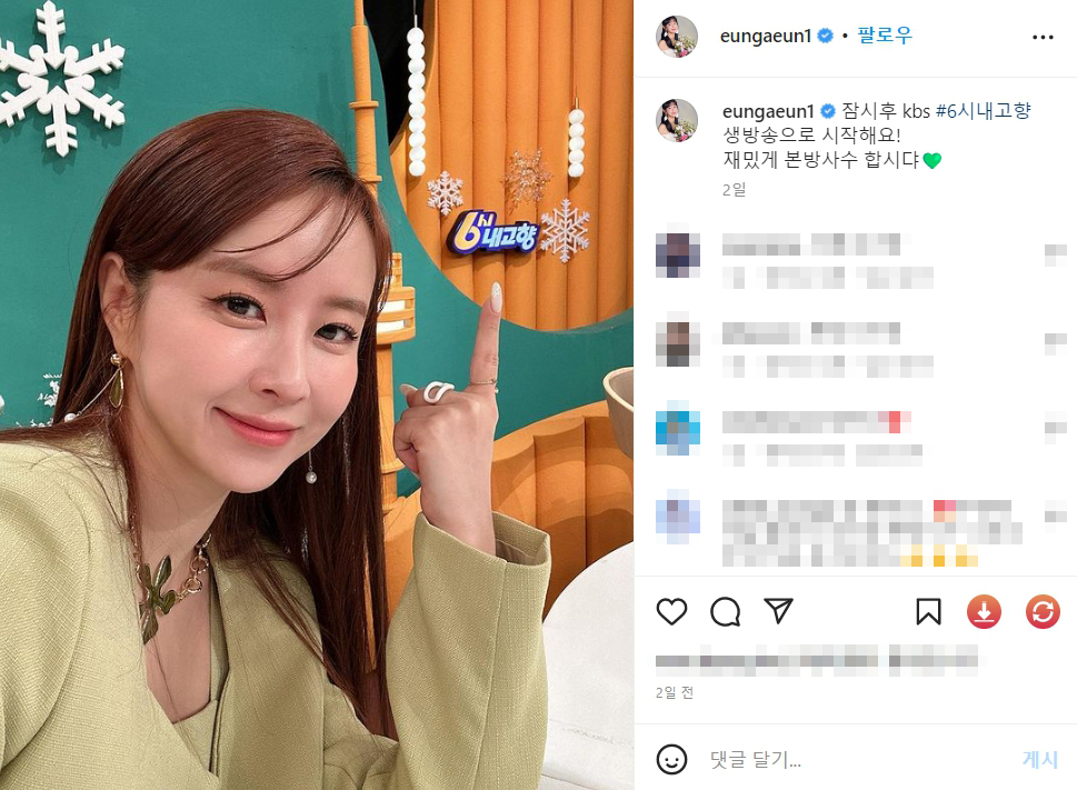 2,699 Likes, 102 Comments - 은가은 (@eungaeun1) on Instagram: "잠시후 kbs #6시내고향 생방송으로 시작해요! 재밌게 본방사수 합시댜💚"
