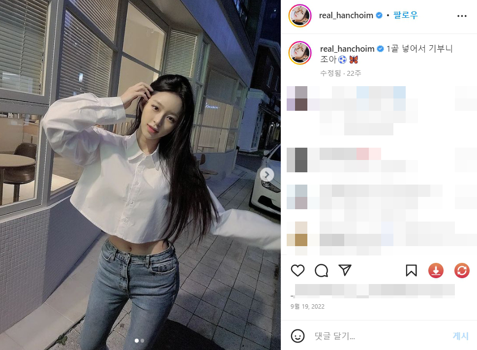 Instagram의 𝑯𝑨𝑵 𝑪𝑯𝑶 𝑰𝑴 🤍님 : "1골 넣어서 기부니 조아⚽️🦋"