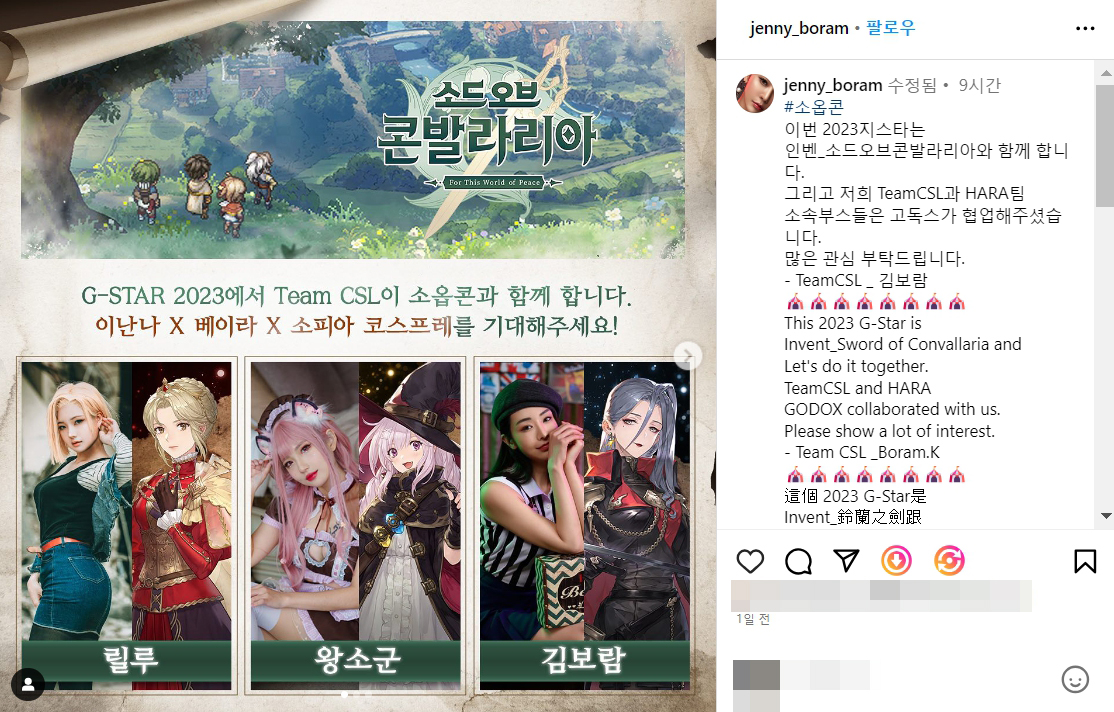 지스타 2023 인벤 부스 소옵콘 모델 김보람 몸매 코스프레 미녀 행사 나무위키 인스타그램