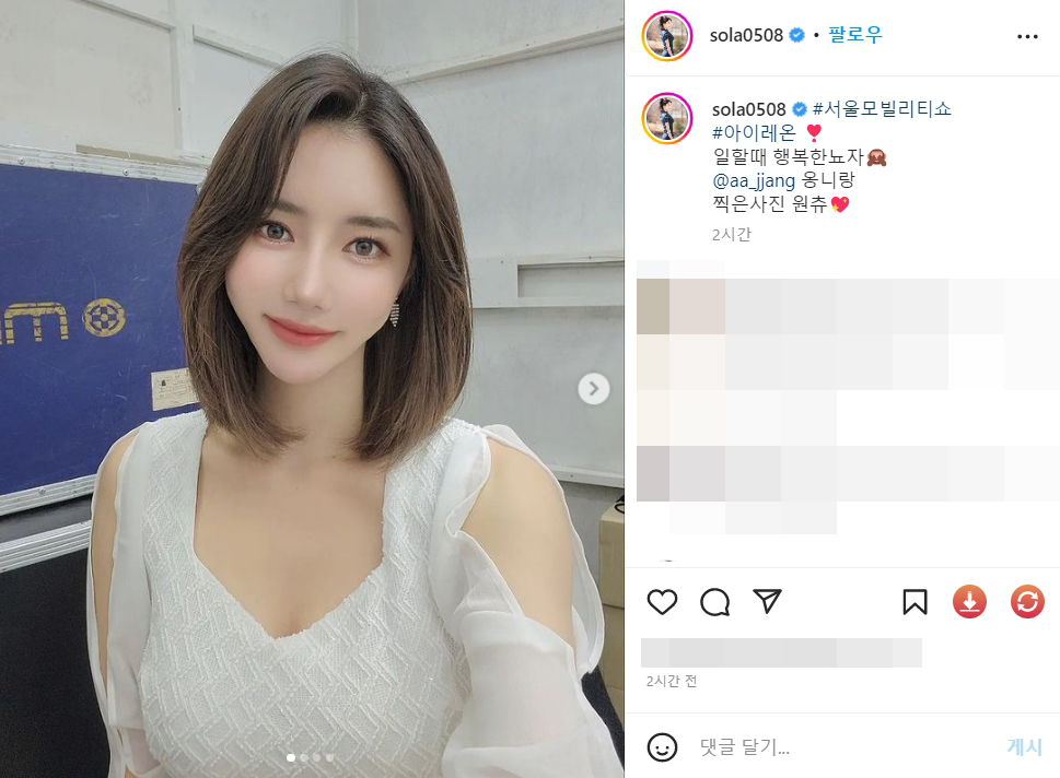 레이싱모델 임솔아 (@sola0508) on Instagram: "#서울모빌리티쇼 #아이레온 ❣️ 일할때 행복한뇨자🙈 @aa_jjang 옹니랑 찍..."