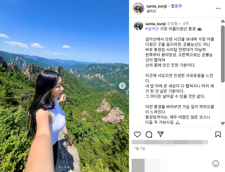 산타은지 등산 유튜버 레깅스 미드 몸매 셀카 사진 인스타