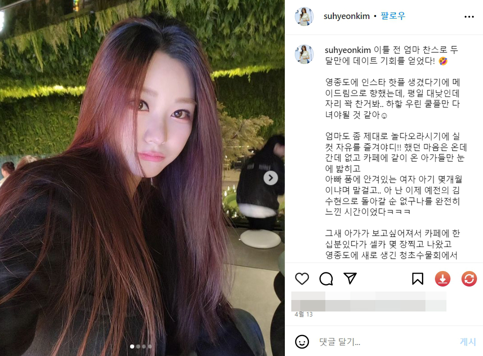 Instagram의 김수현님 : "이틀 전 엄마 찬스로 두 달만에 데이트 기회를 얻었다! 🤣 영