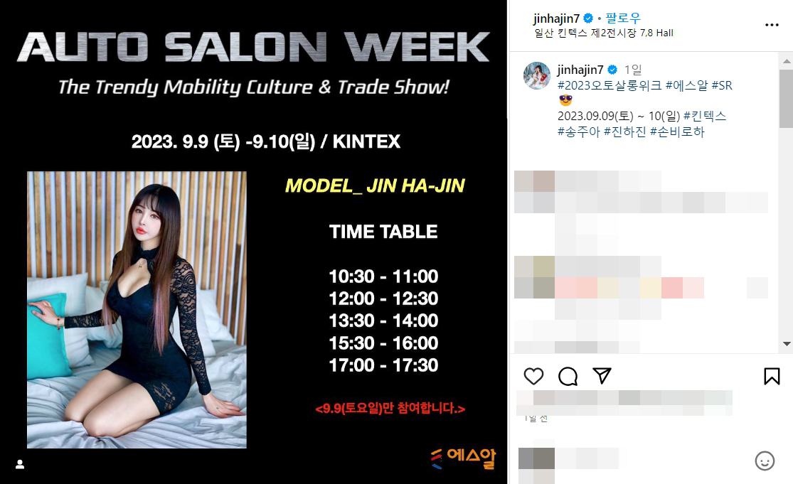2023 오토살롱위크 에스알 레이싱모델 진하진 비키니 노출 몸매 사진 셀카 촬영 인스타그램